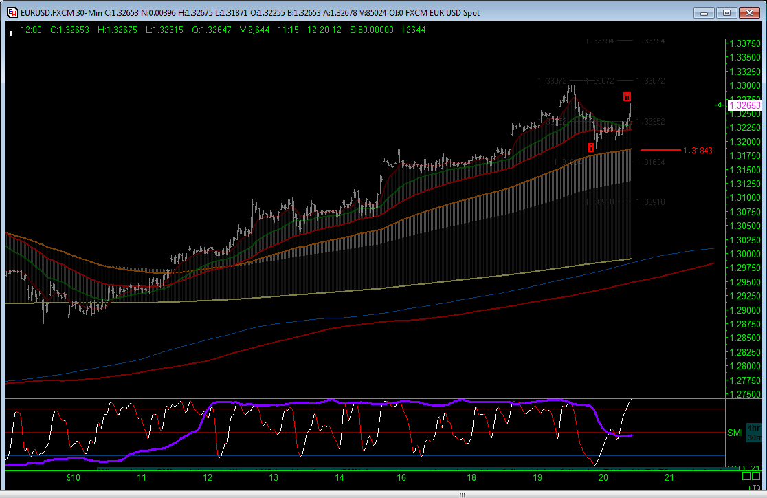 It does not matter how much I 'tut', I have missed out on half this wave and what annoys me more, is that at each stage up from 1.3050 (where I closed my longs), I could have joined again. Something to muse on that, but for now, there is that spike out for the triangle and I am looking for the SMI cycle to cull some higher lows.