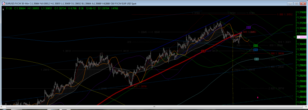 Last night when I went short, the retracement from the assumed top to bottom was 45%. I had said that this was a little light but there was potential for a drop, so I took it. I am counting an 'abc' down to 1.3044 for the 'A' wave (which is what I drew the green My-grid off) and then up to the recent high at 1.3085 as the 'B' wave as an expanded flat. Of interest is that this thrust took the retracement up to 50% of the assumed 'A' wave. If we are now in 'C' down, we have a variety of targets, but the 127% ties up neatly with D3 at 1.2981 and the 162% with the blue grid line at 1.2953. I like this latter one because it is deeper and is just above that Gann line at 1.2941. If it is a 'C' wave, it should thrust and hopefully end in an ending diagonal.