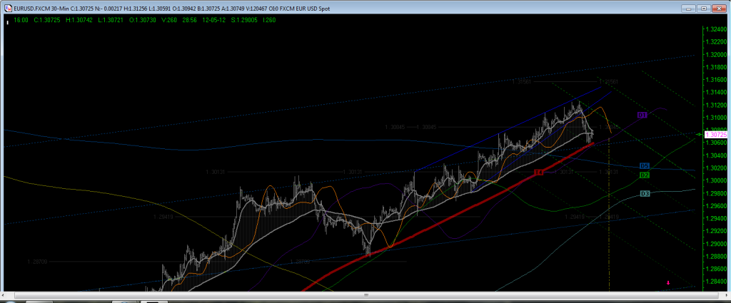 Looking for a bounce to 1.3100 area as part of an 'abc' bounce out of the 1.3060 area as discussed this morning. Then will be looking for confirmation of a turn down into a 'C' leg following 'A' this morning. Here is a chart with the new My-Grid of the move down this morning. The daily My-Wave is under pressure now on the short term chart, but a move right to touch the orange D1/4 line and green grid line would be great place to get confirmation to short again.
