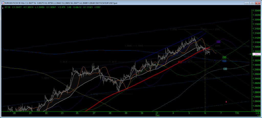 Stop held last night and price making in roads to the support levels. Firstly, the bigger picture location: bouncing for now off the My-Grid wall,calc'd off the 'A' wave down from all time high at 1.6037. Price has made it under T4 (the trendline I follow), under D1, remains under D1/4 and under the blue My-Grid lines up from 1.2659. As such, D5 is in its sights but as that is at the green My-Grid line down from the 1.3125 high yesterday, a break there should see acceleration down to D2, then maybe D3. There lies an obvious place for consolidation in between all three 'D' lines, where the storyboard going forward will be decided. In the short term, the Daily My-Wave is now fully formed to the downside, providing a useful visual of momentum. Back again at D5.