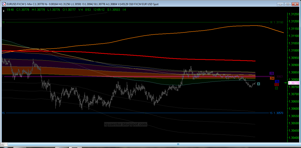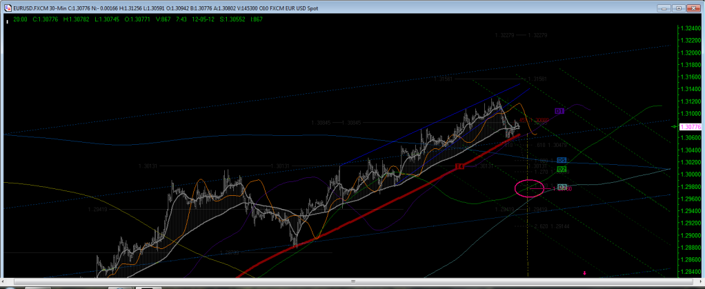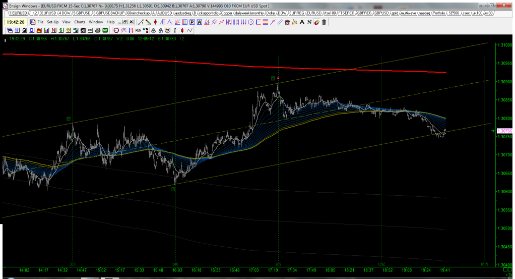 Here is the chart to follow up the 5.13pm post. This is very short term at 15sec per bar but shows the count for that 'abc'. I am short with stop above the high there and thus far there is a chance of this regression channel failing on the first attempt. The daily My-Wave on the 1min chart is looking a lot more bearish than this mornings when I suggested it was primed for a stop run - might be worth looking back at that to see how different it looks. So the first pull down this morning has done more than the last week or so to turn this wave over, albeit it has to be considered a retracement move overall at present. Note how the 4hr trend is under both the 20 & 24hr bands and that the rest are all compressed. If price continues to ferret around under the band, the My-Wave will continue to drip downhill, hopefully into that 'C' wave. Widening out the lens a little, we can see the drop has only been retraced 45% at present, so my short maybe premature and I might lose my few pips trying but the last two charts suggest it was worth ago for the reward ratio. A 100% extension of the current drop from the current retracement high, takes price to D5. To get to D5, price has got to stay underneath D1/4 (orange) and cut D1. If price cuts D1, it brings D2 back into the equation. D2 is not too far away from D3, so if D2 does not hold D3 ..... you get my drift I hope. D3 is at 162% of the current drop/retracement measurements and bang on the green My-Grid parallels for the first drop as an 'A' wave. That looks kinda swoopy to me, and why i entered short with the flimsiest of scenarios to support it. But price bounced off T4 and D1 this morning, so a retest there at least me thinks and if it pushes through, it takes out a blue My-Grid line and the next one is down at the Gann line 1.2941. Enough for tonight - I'll do the bigger picture in the morning and hope my short stop has held.