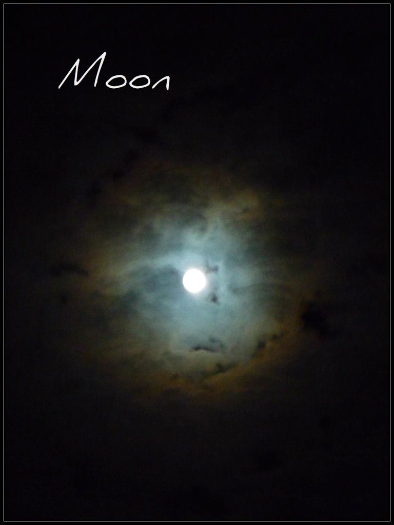 I was out doing the 'bins' and as I turned back towards the house, this 'eye' was staring back at me. Tell the truth, it did not quite look like the photo. Try as I may, I could not get the image I was seeing to be replicated by my digital camera. The sky was completely filled in all directions with mackerel'd clouds of various blues and this moon peeking through like a cosmos eye, eyeballing me doing the bins! Anyhow, hopefully, you get the idea. Photograph: Moon.