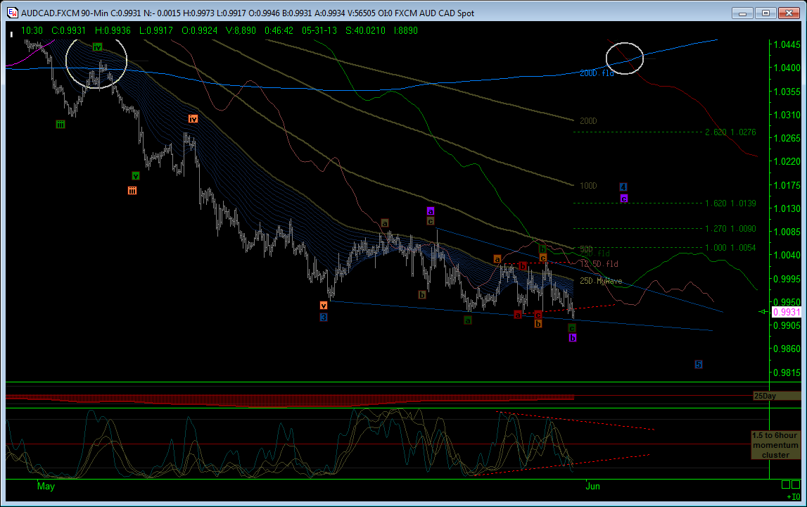 For now, the triangle/diagonal options are looking good but the 12.5D fld is just above again and price would need to get through this to confirm. On my 10min chart I have a gap at about 15390 and this is where the 12.5D fld sits. What am I worried about: the possibility of 1-2s to downside, but that momentum cluster continues to suggest that the aforementioned triangle or diagonal should be kept on top table. I am however, closing my final 'short cover' for profits on this spike up, on the basis that AUDCAD seems to be suggesting that will spike up - if so, on recent form, that would mean the Dow would go down. I am light on the Dow anyhow, so going naked short at 15360