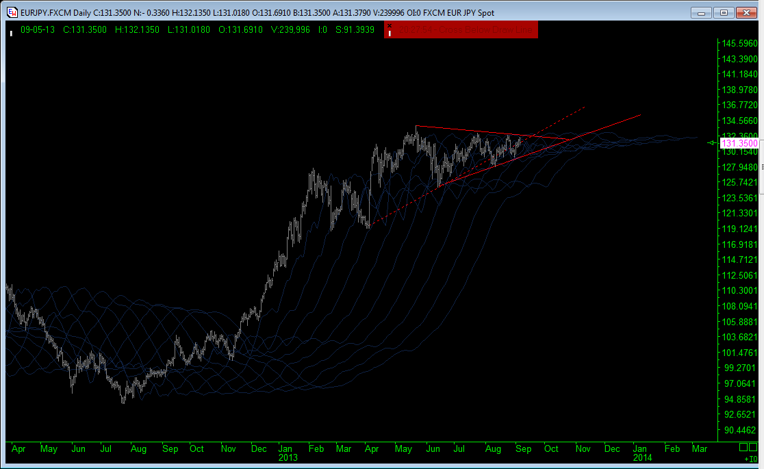 If this is a continuation pattern as a wave 4 or wave b, then price should push out of the top; whether that happens now or after another low is due is not that relevant if the eventual direction is northbound. I have been suggesting that the 100 day cycle low may have already occurred during this consolidation, so timing wise, price is looking for release northbound, at least initially and for that reason, I have been counting a triangle.