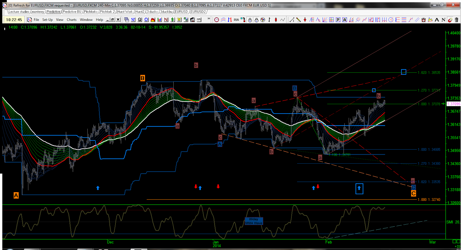 With the 20 & 40 day FLDs pretty well backtested, any trip back north through the 160day FLD, will leave the 80day FLD with all the permissions it needs to progress uphill - see last post. This is the count I am running with for a longer 'e' leg in my 'B' diagonal and likely to follow a contracting diagonal into the close. May as work it right up to the 1.3892 high, but will be flat well before that!!